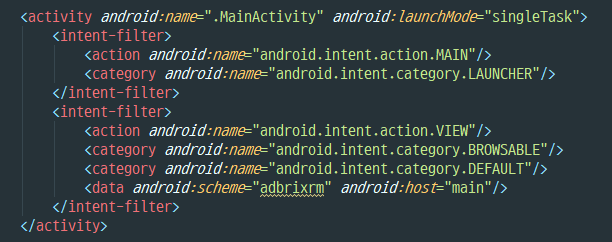 안드로이드의 경우 아래와 같이 Androidmanifest.xml 이라는 파일에 스킴값을 등록합니다.