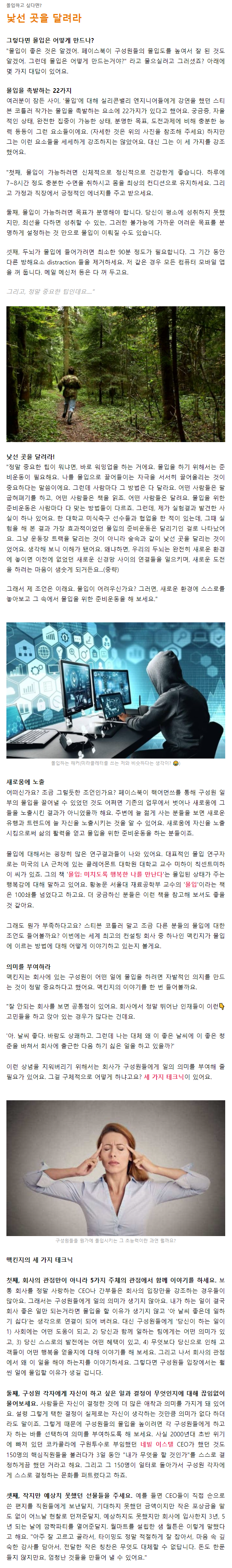"몰입이 좋은 것은 알겠어. 페이스북이 구성원들의 몰입도를 높여서 잘 된 것도 알겠어. 그런데 몰입은 어떻게 만드는거야?" 라고 물으실려고 그러셨죠? 아래에 몇 가지 대답이 있어요.