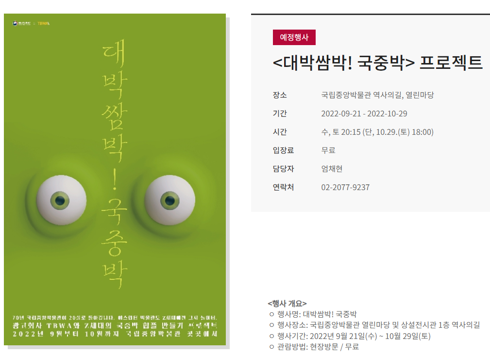 국립중앙박물관,<행사 개요> ㅇ 행사명: 대박쌈박! 국중박 ㅇ 행사장소: 국립중앙박물관 열린마당 및 상설전시관 1층 역사의길 ㅇ 행사기간: 2022년 9월 21일(수) ~ 10월 29일(토) ㅇ 관람방법: 현