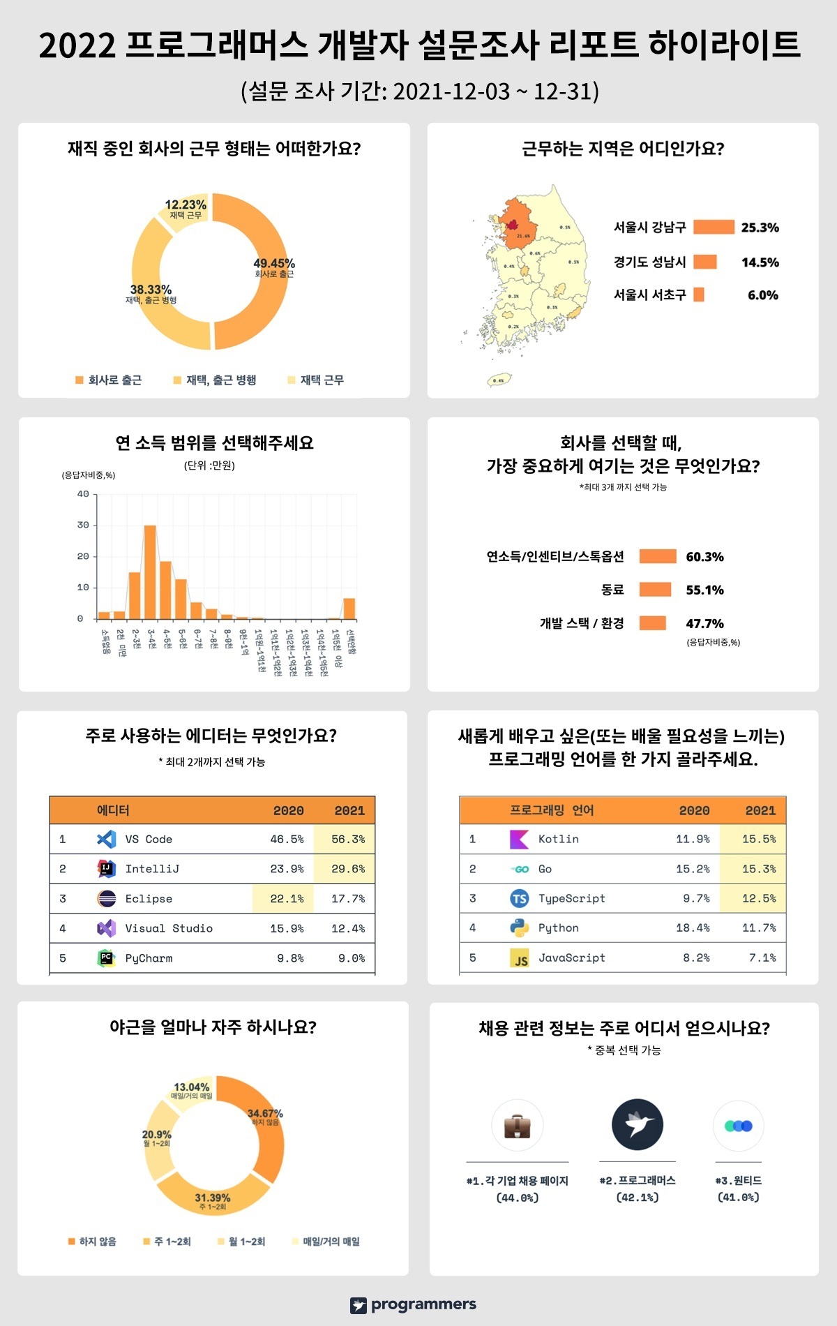 프로그래머스 홈페이지에 공개된 리포트는 프로그래머스를 이용하는 개발자 5,362명을 대상으로 2021년 12월 3일부터 31일간 실시된 온라인 설문조사 결과를 바탕으로 발행됐다. 개발자 설문조사 리포트는 우리나라 개발자들의 생각을 공유하는 목적으로 매년 상반기에 발행한다. 이번 리포트에는 근무 지역·형태, 평균 연소득, 자주 사용하는 툴, 배우고 싶은 프로그래밍 언어, 이직과 구직 시 중요한 점, 채용 정보와 개발 트렌드를 얻는 곳 등 총 35문항을 수록했다.