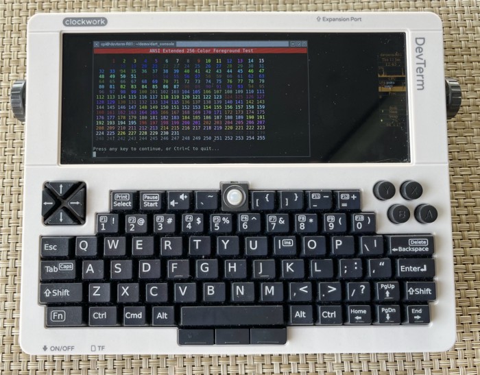 Dart 콘솔 앱을 실행하는 실험용 RISC-V 컴퓨터인 ClockworkPi DevTerm R-01.