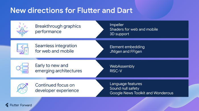 향후 작업을 위한 4가지 테마: 획기적인 그래픽 성능(임펠러, 쉐이더, 3D 지원); 웹과 모바일을 위한 완벽한 통합(요소 임베딩, JNIgen 및 FFIgen) 새롭고 떠오르는 아키텍처(WebAssembly 및 RISC-V)에 초기 단계; 개발자 경험(Dart 언어 기능, 사운드 null 안전, Google News Toolkit 및 Wonderous)에 대한 지속적인 초점.