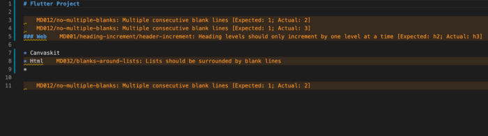 No validators in the Flutter project can ensure the detection of problems in README.md or CHANGELOG.md documents. To remedy this, the Markdownlint plugin provides a set of guidelines to encourage Markdown file standards and uniformity. You can use this extension to check for problems locally and verify the content before publishing it live. Browse the user manualto learn more about rules.