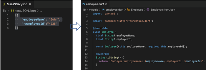 In the following figure, the JSON file is shown on the left, and the required classes and properties are shown on the right, which is produced from the JSON file using the JSON to Dart Model extension.