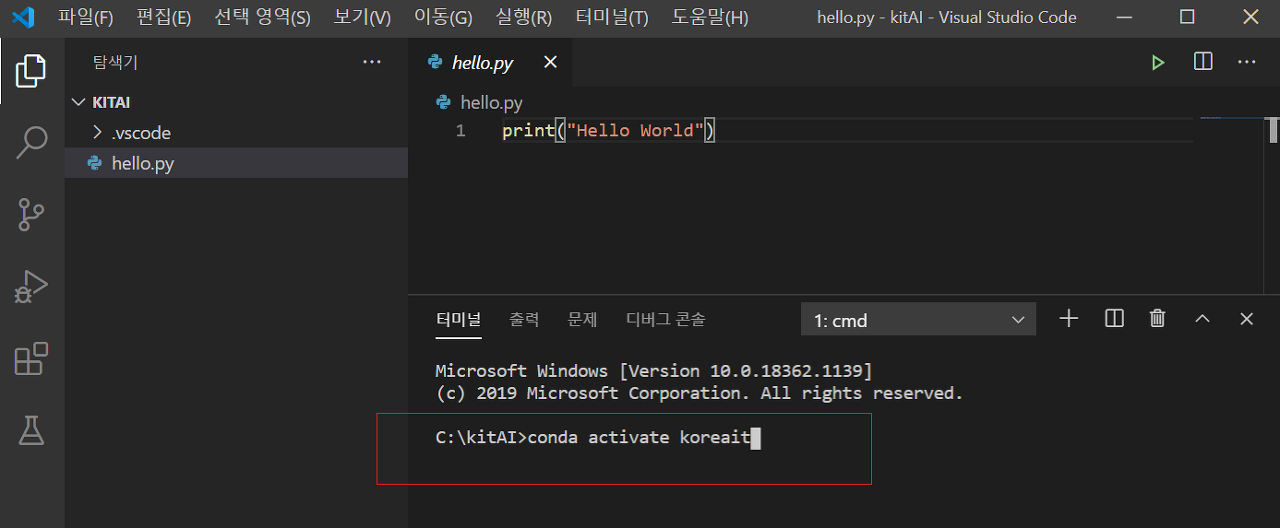 이 작업 폴더에 새 hello.py 파일을 생성하고 에디터에서 코드를 작성합니다. 그리고 해당 폴더에 저장 합니다.