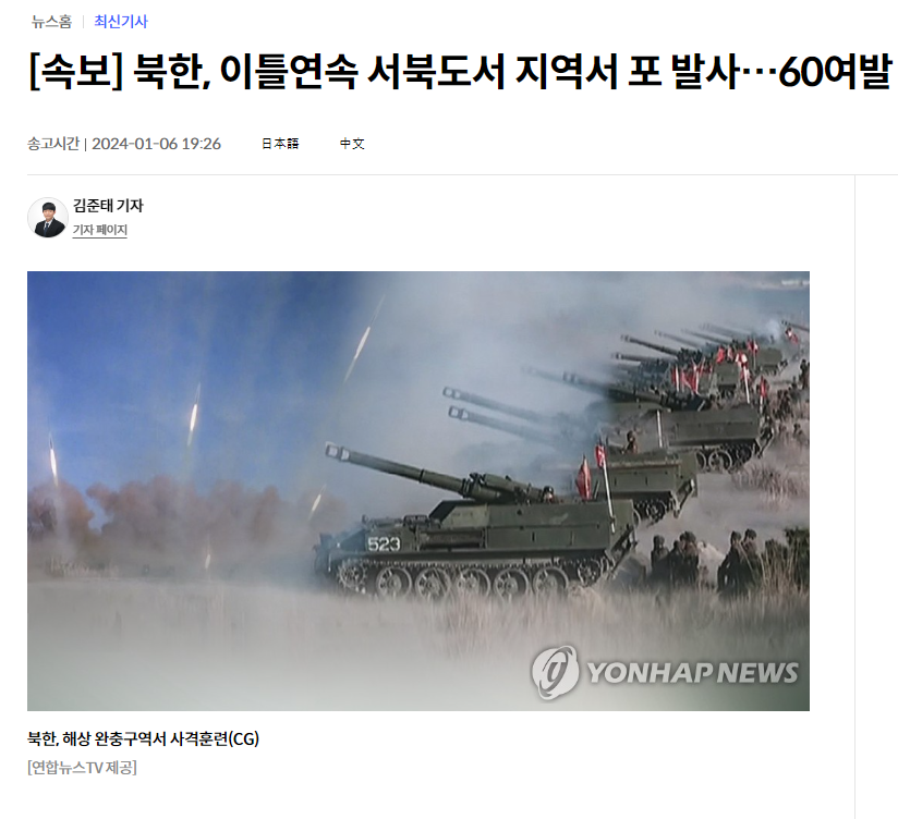 [속보] 북한, 이틀연속 서북도서 지역서 포 발사…60여발 | 연합뉴스
