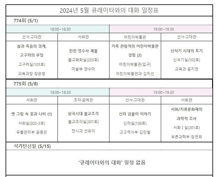 국립중앙박물관,2024년 5월 큐레이터와의 대화 일정표 774회 (5/1) 18:00~18:30 19:00~19:30 선사·고대관 서화관 어린이박물관 선사·고대관 삶과 죽음의 경계, 고구려의 무덤 고구려실(105호) 교육과장 장