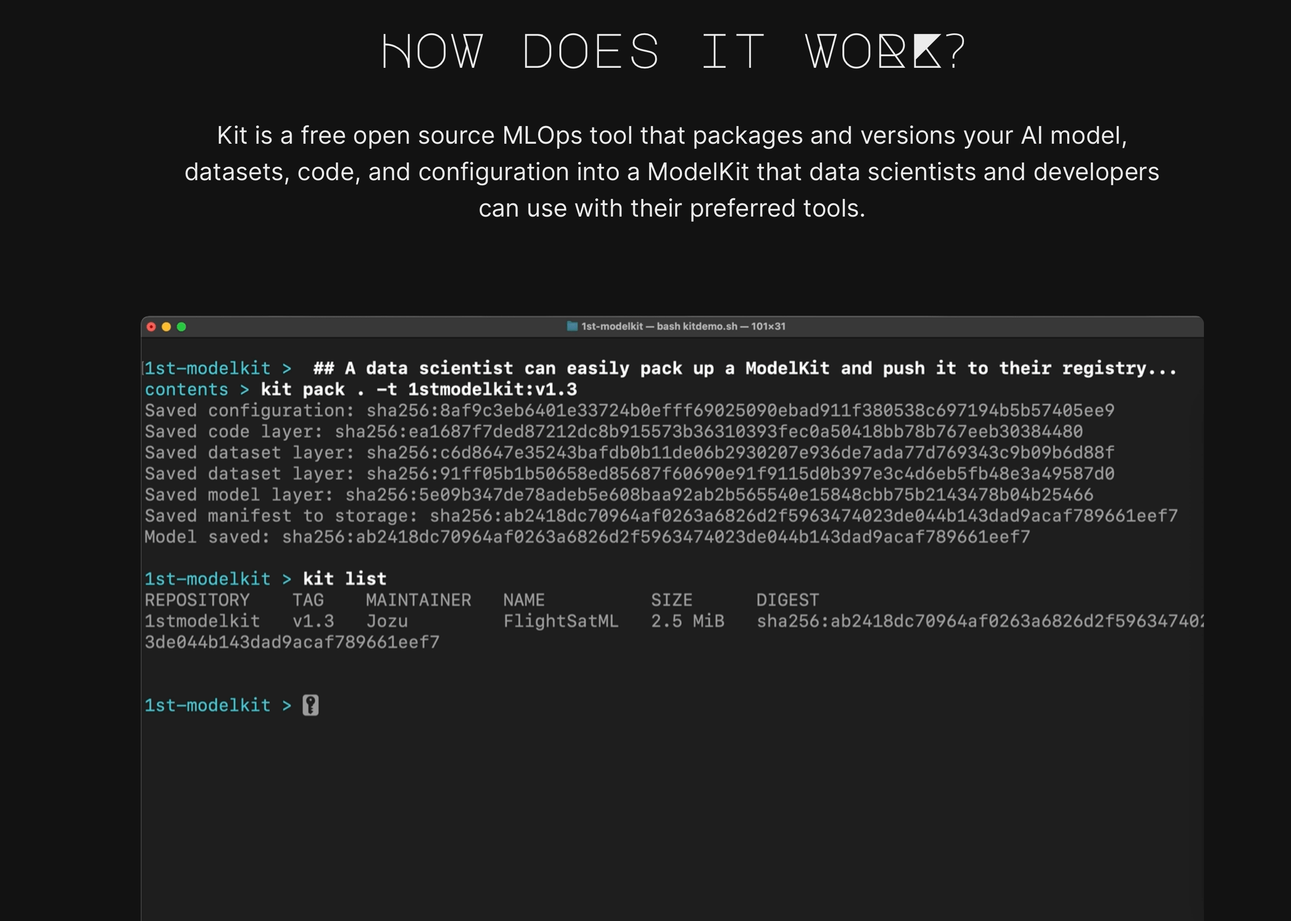 The ModelKit is an immutable OCI-standard artifact that leverages normal container-native technologies (similar to Docker and Kubernetes), making them seamlessly interoperable and portable across various stakeholders using common software tools and environments. As an immutable package, ModelKit is tamper-proof. This tamper-proof property provides stakeholders with a versioning system that tracks every single update to any of its content (i.e., models, code, metadata, and artifacts) throughout the ML development and deployment pipelines.