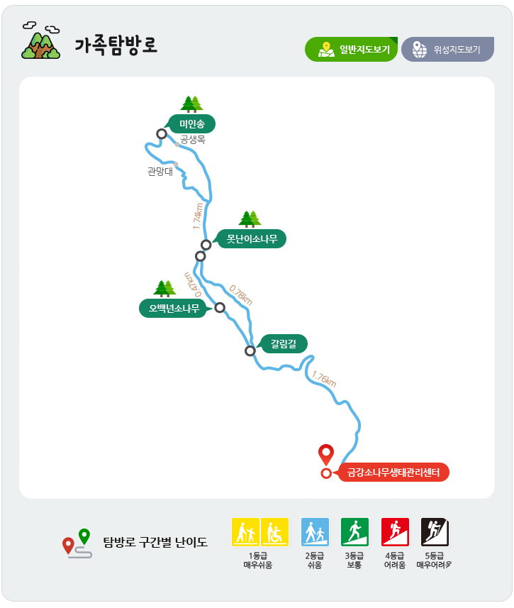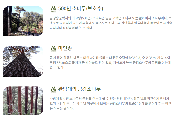 부터 지속적인 관리로 보호수인 500년 소나무와 금강소나무를 한눈에 볼 수 있는 관망대가 있다.