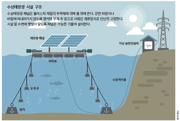 수상태양광 시설은 ‘프레임형’과 ‘부력일체형’으로 나뉜다. 프레임형은 금속 재질의 넓은 바닥 프레임을 제작하고 그 위에 태양광 패널을, 아래에는 물 위에 뜰 수 있도록 부력체를 연결한 방식이다. 구조적으로 안정하지만 비용이 많이 든다. 부력일체형은 부력체를 직접 모듈과 연결하는 방식이다. 건설비는 프레임형에 비해 15~20% 정도 적게 들지만, 구조가 비교적 불안정해 생산하는 전력량도 3~3.5% 줄어든다. 태양광발전 시설의 위치를 고정하기 위해 저수지 밑바닥에는 닻의 역할을 할 계류장치를 설치하고, 수중케이블과 부력체를 연결하는 게 특징이