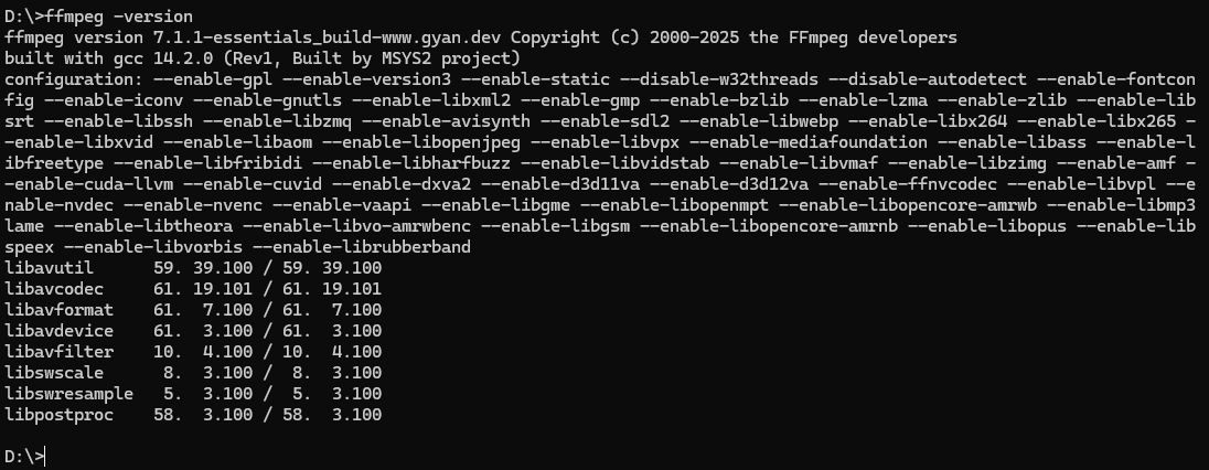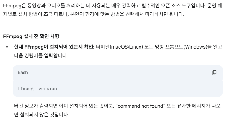 - ffmpeg -version을 입력하여 FFmpeg 버전 정보가 올바르게 출력되는지 확인합니다.