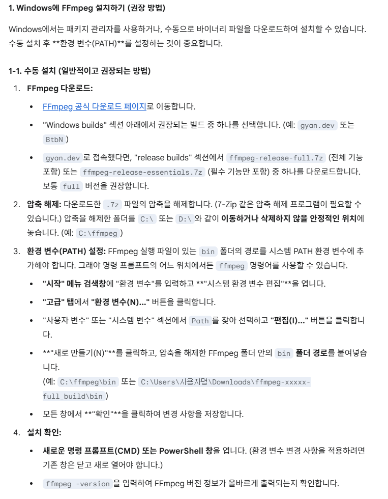 - 환경 변수(PATH) 설정: FFmpeg 실행 파일이 있는 bin 폴더의 경로를 시스템 PATH 환경 변수에 추가해야 합니다. 그래야 명령 프롬프트의 어느 위치에서든 ffmpeg 명령어를 사용할 수 있습니다.