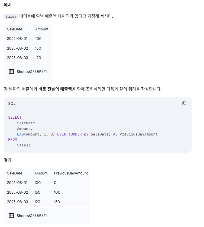 - OVER (ORDER BY SaleDate): 데이터를 SaleDate 오름차순으로 정렬하여 LAG 함수가 순서를 인식하도록 합니다.