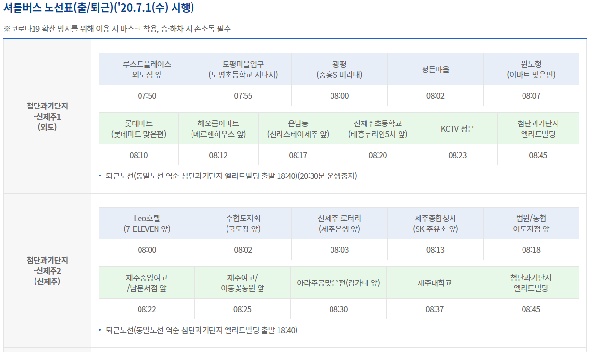 셔틀버스 노선표(출/퇴근)('20.7.1(수) 시행) ※코로나19 확산 방지를 위해 이용 시 마스크 착용, 승·하차 시 손소독 필수 첨단과기단지 -신제주1 (외도) 첨단과기단지 - 신제주1(외도) 출퇴근 노선