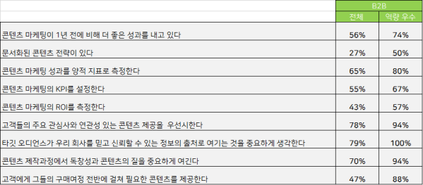 역량이 우수하다고 답한 집단과 응답자 전체 간의 비교를 통해 왜 역량이 우수한지에 대해 유추해 볼 수 있었습니다. 우선 콘텐츠의 질을 중요시 하고, 구매여정 전반에 걸쳐 콘텐츠를 제공합니다. 고객들의 주요 관심사를 분석하고 활용하는 것도 차이가 컸습니다. 문서화 된 전략을 통해 콘텐츠 마케팅 수행의 일관성을 도모하는 것도 차이를 보였습니다.