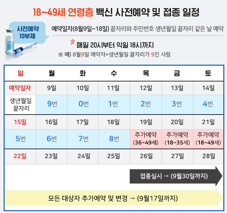 해당 날짜별 예약 대상자는 매일 20시부터 익일 18시까지 예약이 가능하며, 이후 8월 19일~9월 17일 추가 예약 및 예약 변경이 가능하다. 8월 19~21일은 연령대별 추가예약, 8월 22일~9월 17일은 모든 대상자에 대한 추가예약 및 변경이 가능하며, 10부제 예약 미참여자도 가능하다.
