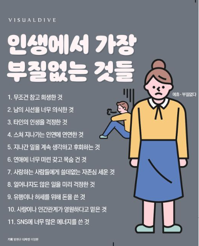 10. 사랑이나 인간관계가 영원하다고 믿은 것 사랑과 인간관계가 영원했으면 하는 바람을 할 때가 있죠. 하지만 슬프게도 영원히 가는 것은 아무것도 없어요. 서로의 마음이 다할 때까지 되도록 오래 유지해 볼 수는 있겠죠. 그런데 영원하지 않다고 해서 그 관계가 의미 없다거나 허무한 것은 아니에요. 순간순간 최선을 다한 관계들은 소멸 후에도 내 마음 깊이 남아 자산이 된다는 것을 받아들인다면, 인생이 조금 더 편안하고 풍요로워질 거예요.