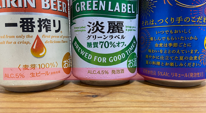 좌측부터 나마비루(생맥주:生ビール), 발포주(発泡酒), 제3맥주(리큐르 발포성:リキュール発泡性)