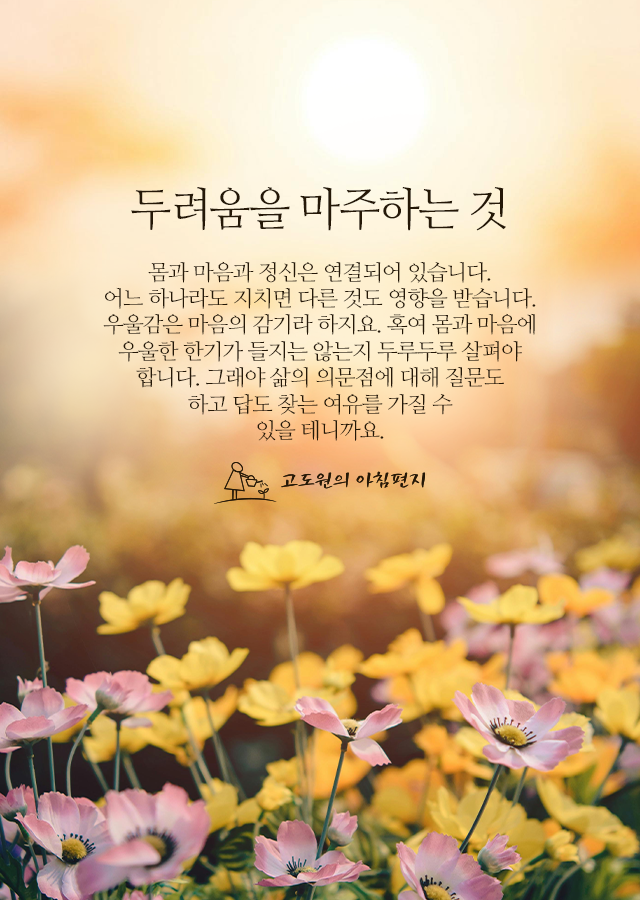 * 몸과 마음과 정신은 연결되어 있습니다. 어느 하나라도 지치면 다른 것도 영향을 받습니다. 우울감은 마음의 감기라 하지요. 혹여 몸과 마음에 우울한 한기가 들지는 않는지 두루두루 살펴야 합니다. 그래야 삶의 의문점에 대해 질문도 하고 답도 찾는 여유를 가질 수 있을 테니까요.