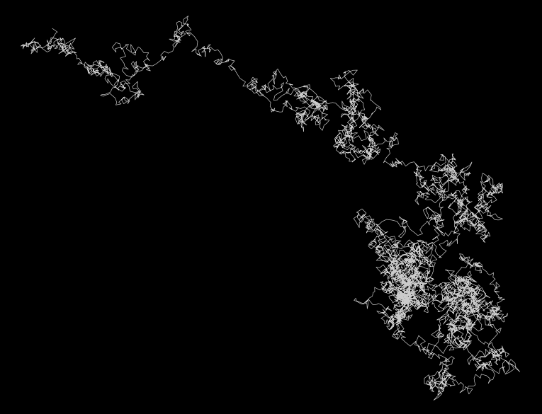 랜덤 워크(Random Walk)를 사용하여 **아트적인 노이즈 트레일(Artistic Noise Trail)**을 만드는 것은 제너레이티브 아트(Generative Art)에서 매우 흔하고 흥미로운 기법입니다. 이는 각 단계에서 **무작위성(Stochasticity)**을 이용해 경로를 결정함으로써 예측 불가능하면서도 유기적인 움직임을 만들어냅니다.