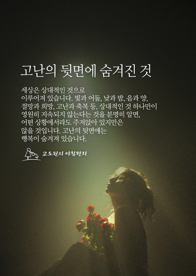* 세상은 상대적인 것으로 이루어져 있습니다. 빛과 어둠, 낮과 밤, 음과 양, 절망과 희망, 고난과 축복 등, 상대적인 것 하나만이 영원히 지속되지 않는다는 것을 분명히 알면, 어떤 상황에서라도 주저앉아 있지만은 않을 것입니다. 고난의 뒷면에는 행복이 숨겨져 있습니다.