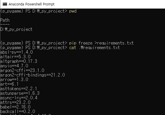 현재 가상환경 패키지 목록 저장하려면 다음과 같이 실행합니다.